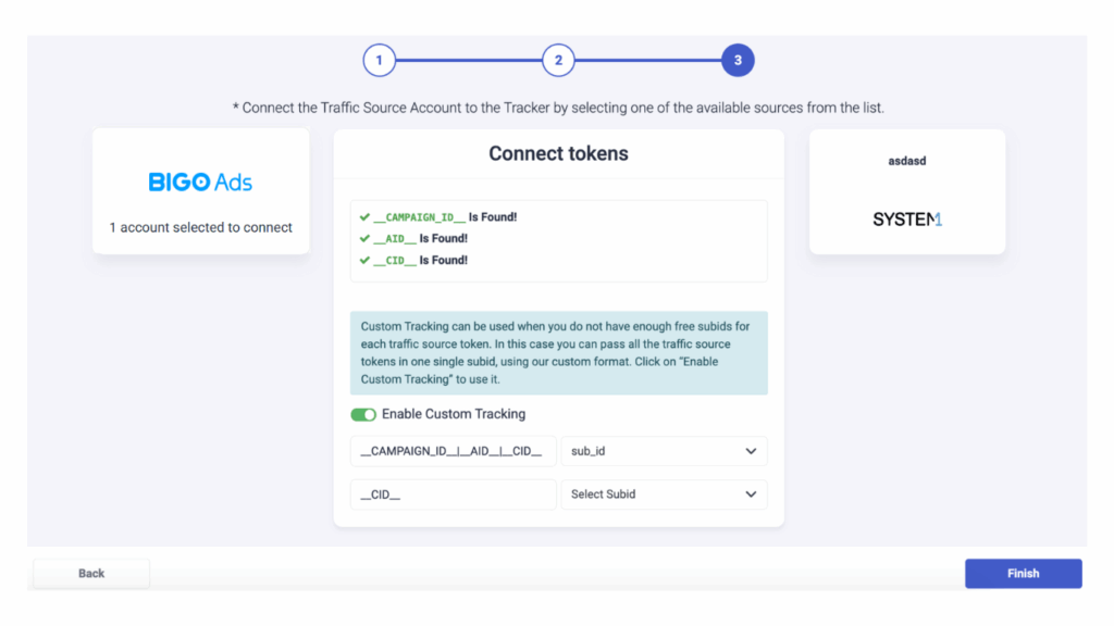 Step 4: Now, it is time to connect your BigoAds accounts to System1. You will need to specify which System1 subids you are using to pass traffic source macros back to System1. Because System1 has only 2 subids available (sub_id and sub_id2), while a traffic source might have more than 2 tokens to map, it is not possible to map each traffic source token on a different System1 subid. This is why you need to use a custom tracking configuration for this search feed. With this option, you can pass all traffic source tokens, concatenated with “|”, in a single System1 subid (like in the screenshot below):
