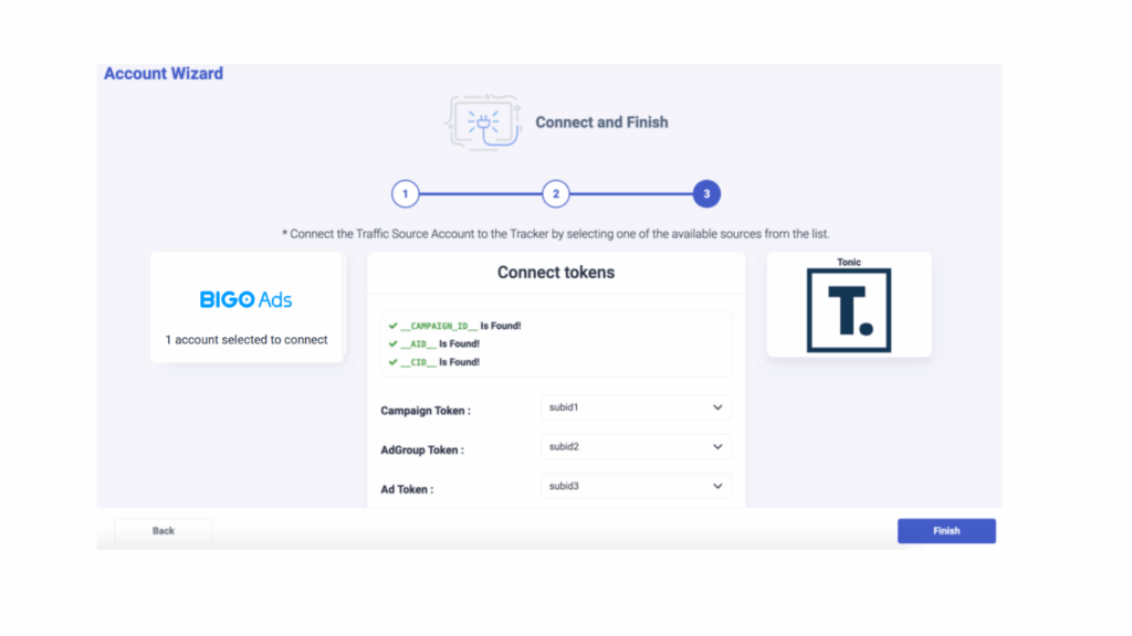 Step 5: As you noticed above, we are passing campaign tokens under subid1, adgroup tokens under subid2, and ad tokens under subid3. Once you click on Finish, you still have to update your BigoAds campaign links to ensure the generated tracking code is present