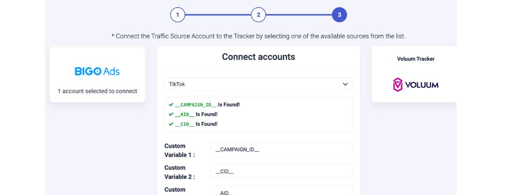 Step 4: To complete the integration, you need to connect your selected BigoAds accounts to Voluum. Select from the drop-down list which of the traffic source configurations found in your Voluum tracker belongs to the BigoAds account you are trying to match