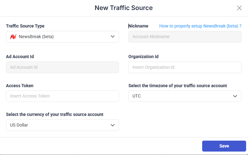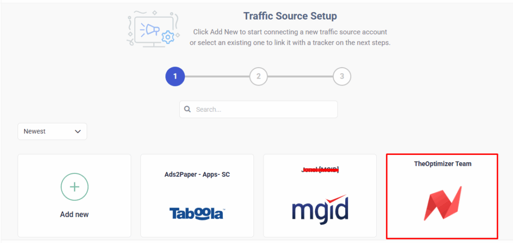 Step 3: Here you will see a drop-down list with all the traffic source integrations TheOptimizer supports. Select NewsBreak