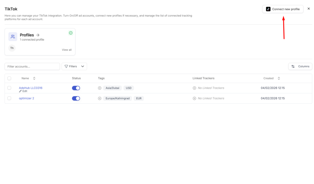 Step 4: When back on TheOptimizer’s Integrations page, you can add one or more Ad accounts / Profiles you want to connect.