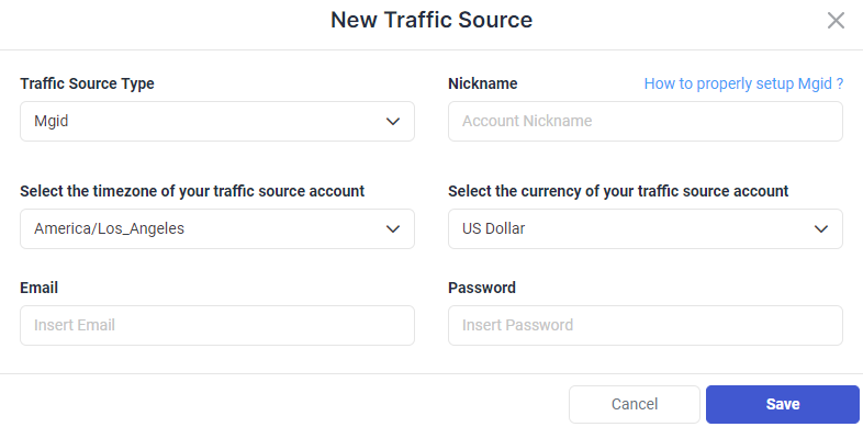 Step 2: On the pop-up integration, click on the traffic source drop-down list and select MGID.