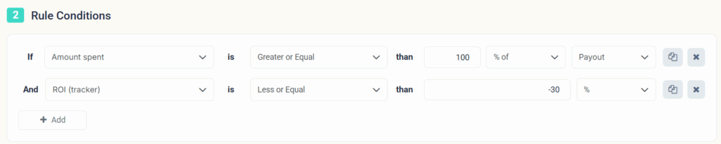 In case you would like to trigger rule actions on independent metrics (which one of the conditions is first met), please create a separate rule.Example: Pause Campaign IF Traffic Source Amount Spent is More Than $800 AND Tracker ROI is Less Than -30%