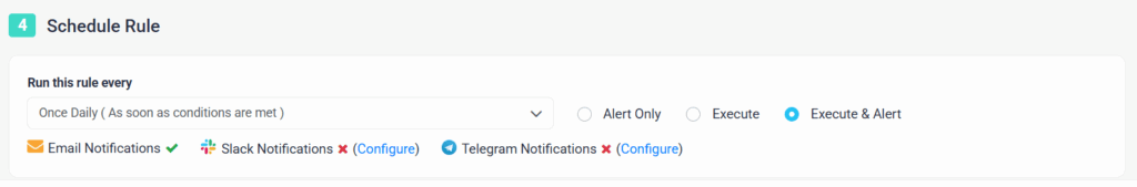 Execute: When conditions are met, TheOptimizer will only execute the desired rule action, but will not send email alert.